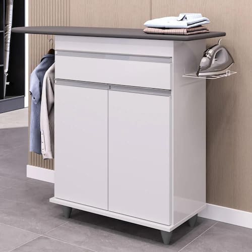 Se organização e funcionalidade estão nos seus parâmetros de busca em encontrar um tábua de passar com balcão que melhor se adapte ao ambiente, então a Lumil Móveis fez a escolha certeira em desenvolver o modelo Larissa! Em termos de estrutura, ele conta com durabilidade e resistência graças a estrutura em MDP, pés em PVC e pintura em Melamina BP. E a funcionalidade é que além da tábua de passar, este complemento também possui cabideiro para pendurar roupas, suporte para deixar o ferro sempre de prontidão, 1 gaveta de corrediças metálicas e puxadores cromados, 2 portas com o mesmo tipo de puxador e 1 prateleira interna! Ah, e graças ao design versátil pode fazer parte da área de serviço, quarto ou onde preferir!