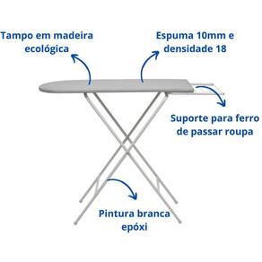 Já a parte do tampo é feito com madeira ecológica, com espuma de 10mm e densidade 18, e ainda possui tecido metalizado e suporte para descansar o ferro de passar roupa.