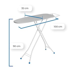 O tampo em madeira MDF, com dimensões de 100 x 32 cm, é liso, durável e livre de desíniveis comuns em tábuas de aglomerado. A espuma de poliuretano de 0,7 cm com densidade D16 proporciona maciez ao passar roupas, enquanto o forro metalizado 100% algodão, resistente a altas temperaturas, reflete o calor, evitando a sensação escaldante e tornando a tarefa mais eficiente e segura.