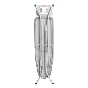 O tampo em chapa de aço expandida minimizada é leve e eficiente, contando com furos de 0,6 cm x 0,3 cm que permitem a passagem do vapor do ferro, prevenindo o acúmulo de umidade, mofos e bactérias. Suas dimensões generosas de 124 cm x 37 cm garantem espaço suficiente para manusear roupas maiores com facilidade.