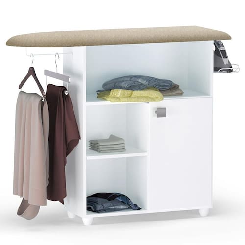 Tábua de Passar Mariana, solução ideal de praticidade e organização para tarefas do dia a dia. Produzida em MDP de 12/15 mm (fundo de 3mm) com acabamento em pintura UV. Conta tábua passadeira estofada com espuma e revestida com tecido poliéster, porta com dobradiças metálicas, cabideiro auxiliar lateral, prateleira interna, nichos abertos funcionais e suporte lateral para ferro elétrico (aparelho não incluso), além de pés e puxadores em plástico. IMPORTANTE: O tecido da tábua passadeira é enviado de forma ALEATORIA, sem opção de escolha de cor ou estampa! Produto será entregue em 01 volume.