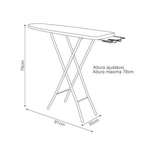 A Tábua de Passar Roupa Isabela é dobrável, possui altura ajustável com máxima de 78 cm e vem com capa de proteção térmica resistente ao calor. Compacta e funcional, é perfeita para quem busca eficiência sem abrir mão de espaço.