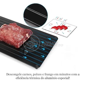Feita com alumínio especial, essa tábua reduz drasticamente o tempo de descongelamento. O que antes levava uma hora, agora pode ser feito em apenas 25 minutos! Ideal para carnes, legumes, frutas e peixes, ela transforma sua rotina culinária com simplicidade e inovação. Além disso, com seu design elegante na cor preta, ela se adapta perfeitamente a qualquer estilo de cozinha.