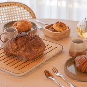 Seu diferencial está na tábua de corte com sulcos para recolher migalhas, mantendo a bancada sempre limpa.