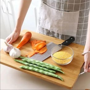 A tábua para corte facilita o preparo de alimentos, oferecendo uma superfície estável para o corte de vegetais, carnes e pães. Sua construção em bambu atua na preservação do fio das facas, auxiliando na durabilidade dos utensílios de corte.