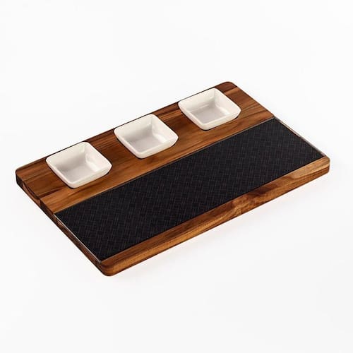 Tábua Para Servir Com Vidro E 3 Potes - Stolf Tábua para Servir com Vidro e 3 potes - Stolf - Características Gerais do Produto: - Características: Acompanha 3 potes e lâmina vidro - Medidas: 25x39x1,8cm - Fabricante: Stolf - Material: Madeira Teca; Vidro - Acabamento: Lixado sem rebarbas - Formato: Retangular - Cuidados: Evite esponjas ásperas na limpeza do produto, é indicado o uso de esponjas macias para não arranhar; Não utilizar produtos químicos na limpeza do produto.; Não deixar exposto ao sol por muito tempo.; Não deixe o produto submerso em água, isso pode entortar a madeira.; Guarde o produto em um arejado, evitando gavetas e locais úmidos.; Não utilizar em micro-ondas; Não utilizar em lava-louças