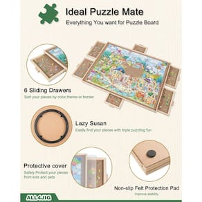 -?6 gavetas e capa protetora?6 gavetas deslizantes permitem que você classifique suas peças por cor, tema ou borda. Mantenha-as categorizadas ao montar seu quebra-cabeça. Cada gaveta é especialmente projetada com alça, para garantir que todas as gavetas sejam facilmente abertas durante o uso, evitando que as peças desapareçam. Com uma capa translúcida para proteger bem sua obra-prima da poeira, da água e do curioso Dr.Cat até a próxima vez que você quiser continuar.