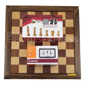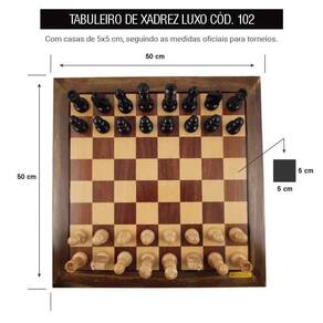 Dimensões e Peso do Tabuleiro e Peças:Tabuleiro: 50 x 50 x 1,5 cmPeças de Xadrez: Altura variável de 5,5 a 10 cm, com diâmetro de base de 28 a 35 mmPeso Total Aproximado: 3 kg