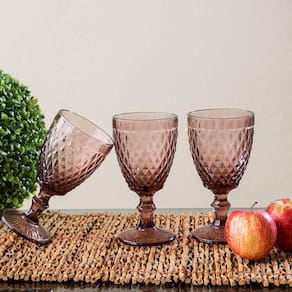 Esse jogo é composto por 6 (seis) lindas taças de vidro tipo murano. Cada taça é produzida com vidro de alta qualidade e a superfície externa possui altos-relevos de formas cruzadas que dão charme, elegância e segurança na pegada.