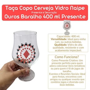 Design único inspirado no naipe de ouros do baralho. Fabricado em vidro de alta qualidade, garantindo durabilidade e resistência. Capacidade de 400 ml, ideal para servir cervejas, chopes e outras bebidas. Presente perfeito para colecionadores ou amantes de jogos de baralho e boa bebida.
