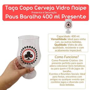 Design único inspirado no naipe de ouros do baralho. Fabricado em vidro de alta qualidade, garantindo durabilidade e resistência. Capacidade de 400 ml, ideal para servir cervejas, chopes e outras bebidas. Presente perfeito para colecionadores ou amantes de jogos de baralho e boa bebida.