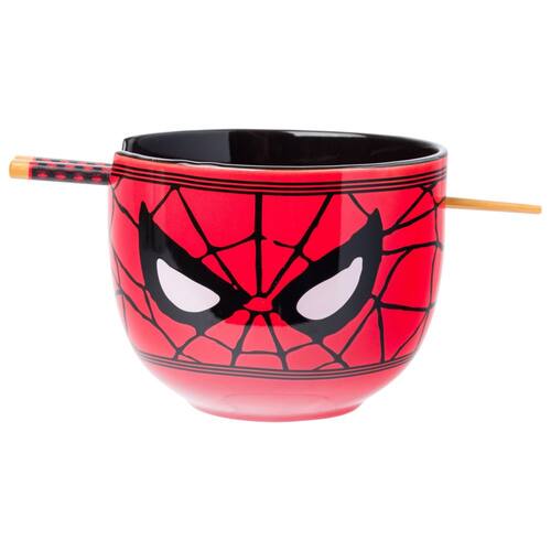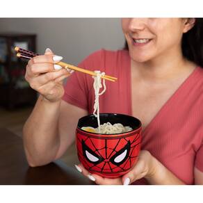 - DESIGN ICÔNICO: Coma cada refeição com esta tigela de ramen de cerâmica de 20 onças com os olhos icônicos do Homem-Aranha em vermelho e preto ousados. Inclui um entalhe e um orifício convenientes para segurar os pauzinhos de madeira incluídos.