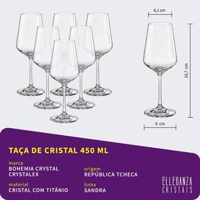 DETALHES DO PRODUTO Material: Cristal com titânio, mais resistente que o cristal comum Origem: Produto importado da República Tcheca Produto: Taça de cristal Quantidade: 06 taças Capacidade: 450 ml cada taça Tamanho: 23,7 cm de altura, 6,1 cm de diâmetro de bocal e 8 cm de diâmetro de base Marca: Bohemia Crystal Fábrica: Crystalex Linha: Sandra Embalagem: Os produtos são cuidadosamente envolvidos por plástico bolha e entregues na caixa do fabricante, inserida em outra caixa reforçada para assegurar a integridade do produto no transporte. Substituímos produtos danificados no transporte.