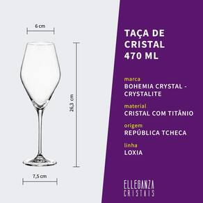 Taça de cristal bohemia para vinho 470 ml loxia 2 peças Jogo com 2 taças de cristal para vinho tinto com 470 ml da linha loxia bohemia crystal Resistência titânio e cristal ecológico Detalhes do produto Material: cristal com titânio, mais resistente que o cristal comum Origem: produto da república tcheca Produto: taça de cristal Quantidade: 02 taças Capacidade: 470 ml cada taça Tamanho: 26,3 cm de altura, 6 cm de diâmetro de bocal e 7,5 cm de diâmetro de base Marca: bohemia crystal Linha: loxia Embalagem: o produto é cuidadosamente envolvido por plástico bolha e inserido em uma caixa reforçada para assegurar a integridade do produto no transporte. Substituímos produtos danificados no transporte. Postamos nossos produtos nos correios de 01 a 02 após a compra. Todos os nossos produtos acompanham a impressa. Trocas e devoluções Seguimos todas as normas vigentes no código de defesa do consumidor. Adicionalmente, trocamos produtos danificados no transporte. Informações relevantes 1. Já imaginou beber ou servir suas bebidas em taças ou copos de cristal com classe e sofisticação A elleganza cristais comercializa produtos com preços excepcionalmente abaixo do mercado, de qualidade assegurada pela marca tcheca bohemia crystal. Após anos de pesquisa e desenvolvimento, distribui em mais de 100 países cristal de espessura bem fina, livre de Cinza, com design e transparência incríveis. 2. Mas cristal não quebra facilmente Não. O cristal com titânio é muito mais resistente a impactos e mudanças de temperatura se comparado ao cristal comum, proporcionando maior segurança e comodidade no manuseio. A elleganza cristais trabalha apenas com produtos contendo titânio em sua composição, trazendo excelência e qualidade a preços imbatíveis. Sobre a bohemia crystal A bohemia crystal é líder global no mercado de cristais, com atuação em mais de 100 países. Fabrica seus produtos na república tcheca e realiza altos investimentos no desenvolvimento e melhoramento de seus produtos para garantir-lhes qualidade de ponta e ser referência global de qualidade e sofisticação. Eles foram os precursores do movimento que tornou o cristal um material ecológico, sem Cinza em sua composição. Também se destacam de outras marcas ao adicionar titânio para seus produtos mais especiais e assegurar resistência muito superior ao cristal comum. A marca oferece aos seus clientes uma vasta gama de produtos, desde utensílios domésticos a itens para indústria química. Cada linha de produto tem sua embalagem personalizada de acordo com suas características e tamanho. Marca: Não Informado