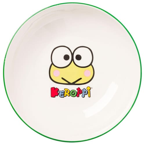 - Tigela de jantar Keroppi: o centro da tigela apresenta Keroppi com seu nome escrito abaixo dele. O exterior da tigela é decorado com corações, maçãs e pipoca. A borda da tigela é verde.