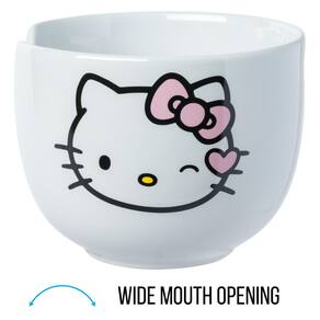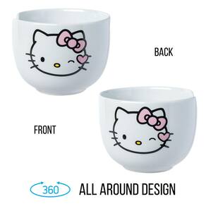 — SANRIO HELLO KITTY: a tigela de ramen apresenta Hello Kitty piscando adoravelmente. Ilustrado ao lado dela está um coração rosa. O design é apresentado em ambos os lados. A tigela de cerâmica é branca e vem com um par de pauzinhos com “Hello Kitty” escrito neles.