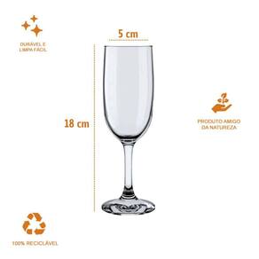 Modelo: Champagne Cor: Transparente Material: Vidro Capacidade: 180 ml Peso: 0,192 kg (Cada Unidade) Altura: 19 cm Diâmetro da boca: 5 cm