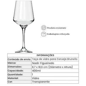 Essa belíssima Taça de vidro para Cerveja 400ml Brunello Transparente vai super bem com qualquer tipo de decoração, graças ao seu aspecto clássico que combina com tudo, vai ornar perfeitamente com os demais utensílios que você tem. Ela será perfeita para usar em festas com seus amigos e família, seu design clean deixará suas comemorações ainda mais elegantes e sofisticadas. Fabricada em vidro de qualidade essa taça apresenta uma excelente resistência. Informações Importantes; Medidas aproximadas - 8,7 x 18,6cm Diâmetro x Altura Capacidade - 400ml Composição - Vidro Cor - Transparente Validade - Indeterminada Fabricante - Nadir Figueiredo Conteúdo do envio - 1 unidade da Taça de vidro para Cerveja 400ml Brunello Transparente. Produto 100% nacional Mais Informações; Evite pancadas ou impactos pois podem trincar, lascar ou danificar o produto. Pode ser lavado em lava louças. Ao lavar use de preferência detergente neutro, esponja macia e enxague com água em abundância. Taça de vidro para Cerveja 400ml Brunello Transparente