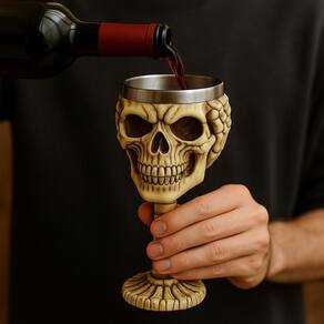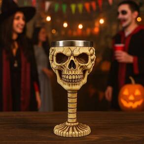 A taça decorativa Negócio de Gênio Cálice Caveira Não Ouço é ideal para servir vinho, chopp ou cerveja com estilo diferenciado. Com capacidade de 180 ml, combina material externo em resina de alta resistência com interior em aço inoxidável, garantindo praticidade no uso. O design medieval em formato de caveira e estilo gótico decorativo traz um visual marcante para sua coleção ou bar. Pode ser usada em festas temáticas, Halloween, eventos especiais ou como peça decorativa em estantes e mesas. A marca oferece ainda garantia de 3 meses para o produto.