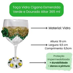 Taça Vidro Cigana Esmeralda Verde e Dourado Altar 365 ml Taça Vidro Cigana Esmeralda Verde e Dourado Altar 365 ml Traga uma aura de espiritualidade e beleza ao seu altar com nossa Taça de Vidro Cristal da Bialluz, inspirada na Cigana Verde Esmeralda. Esta peça única combina a elegância do cristal com elementos que evocam a sabedoria e a tradição ciganas. Feita com vidro de alta qualidade, possui acabamentos delicados e cores vibrantes, sendo perfeita para decoração de altares, mesas e ambientes que buscam um toque de misticismo e autenticidade. Transforme seu espaço sagrado com esta taça encantadora, que não só embeleza, mas também carrega significados profundos. A Taça de Vidro Cristal Cigana Verde Esmeralda é uma peça essencial para quem busca harmonizar o ambiente espiritual com a beleza estética, criando um refúgio de paz e inspiração.
