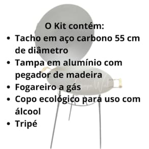 Itens Inclusos: - tacho 60 cm em aço carbono - tampa em alumínio e pegador em madeira - fogareiro a gás - fogareiro a álcool (copinho ecológico) - suporte com tripé