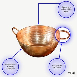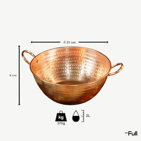 O cobre 100% puro é conhecido por sua excelente condução térmica, garantindo um cozimento uniforme e eficiente. Ideal para o preparo de doces artesanais, compotas, molhos e receitas de longa cocção, este tacho proporciona sabor e textura incomparáveis aos seus pratos.