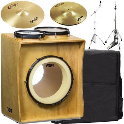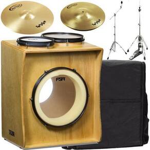 Dimensões : altura 67cm / largura 53cm / profundidade 40cm.peso : 11kgcaixa 8 / ton 10 / bumbo 14itens inclusos- tajon profissional fsa- máquina para chimbal - estante para prato- pedal para bumbo- banco bb100 saty- prato hi hat 13 polegadas- prato crash 16 polegadas- certificado