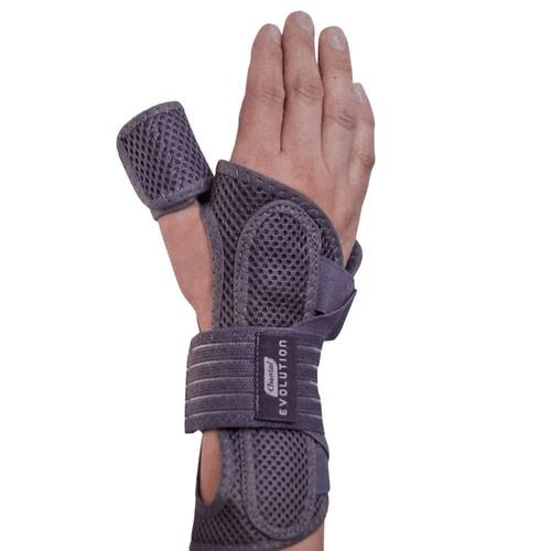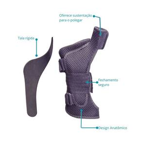 Confeccionada em tecido respirável e forro interno para oferecer ao usuário sustentação e conforto. Possui duas talas, uma em plástico rígido posicionada na palma da mão que acompanha anatomia da região do punho e polegar, leve e resistente, que não resseca ou quebra com o passar do tempo, a outra tala é flexível, e fica posicionada no dorso da mão garantindo assim uma estabilização adequada.