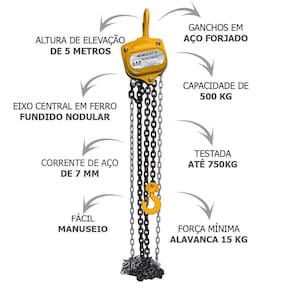 Benefícios: - Capacidade de carga de até 500 kg. - Altura de elevação de 5 metros. - Ganchos com trava de segurança. - Polia em ferro fundido para maior durabilidade.
