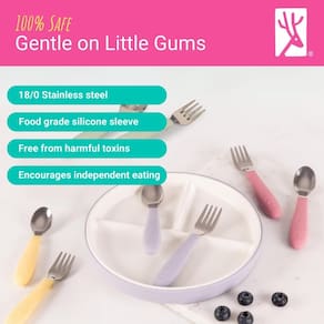 - Seguro para bebês/crianças: as colheres + garfos Elk and Friends apresentam pontas estreitas de aço inoxidável e uma alça de silicone antiderrapante ergonômica fácil de segurar, facilitando o manuseio das mãos pequenas
