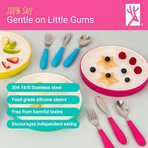 - Seguro: perfeito para bocas de crianças com bordas arredondadas e colher profunda. Há um pequeno descanso de coração na parte de trás da colher para facilitar o suporte e manter a ponta do utensílio longe de bagunça e germes.