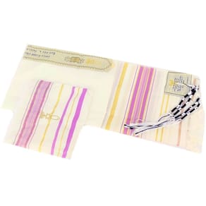 talit messiânico - importado de israel medidas: 55 cm x 1,80 cm tecido: acrilã - 100% poliéster. Cor: roxo claro e dourado - com atara e tzitzi do talit em azul com dourado. Segue com bolsa de transporte