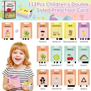 O pacote: O tamanho é 3,74 polegadas x 0,8 polegadas x 3,74 polegadas. 112 unidades de cartões infantis de dupla face, um leitor de cartão, um cabo de carregamento USB e uma mini mochila escolar.
