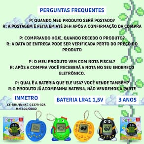 Recomendado para crianças a partir de 3 anos, o Brinquedo Bichinho Virtual Tamagotchi 168 Em 1 - Amarelo é seguro e possui certificação do Inmetro 002609/2021 . Ele também proporciona benefícios no desenvolvimento infantil, como coordenação motora e visual, percepção visual, audição e tato, além de auxiliar na compreensão de cores e formas.