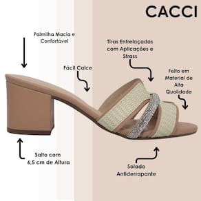 Possui tiras entrelaçadas com aplicações de strass, tornando-a mais especial e bela, seu solado é antiderrapante e trás muita segurança ao caminhar junto ao seu salto bloco super sofisticado. Sua palmilha macia e confortável, permanecendo sempre o conforto para todas as ocasiões. Leve com você os melhores calçados, vá para todos os lugares e combine looks incríveis com ela. Adquira já a sua Cacci!