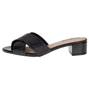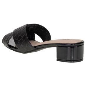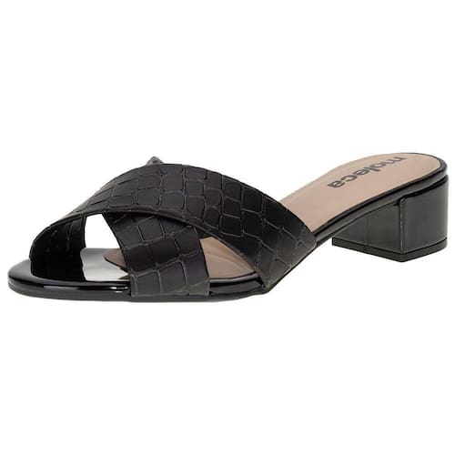 O Tamanco Feminino Salto Grosso Moleca é confeccionado em Napa Color Croco Neo com detalhes envernizado, acabamento em costura, forro interno em têxtil, palmilha em PU e solado em borracha antiderrapante com salto de quatro centímetros e meio.