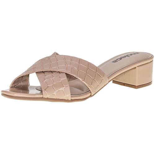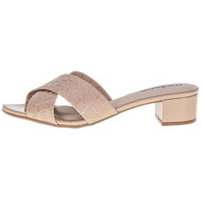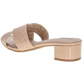 O Tamanco Feminino Salto Grosso Moleca é confeccionado em Napa Color Croco Neo com detalhes envernizado, acabamento em costura, forro interno em têxtil, palmilha em PU e solado em borracha antiderrapante com salto de quatro centímetros e meio.