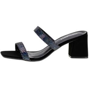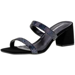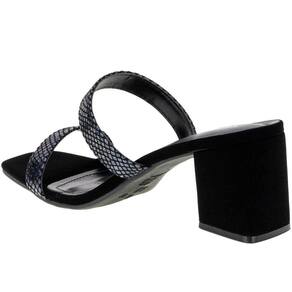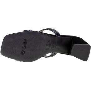 O Tamanco Feminino Salto Grosso Via Marte é confeccionado em Nobuck cintilante com acabamento em costura, palmilha em PU e solado em borracha com salto grosso de sete centímetros aproximadamente.