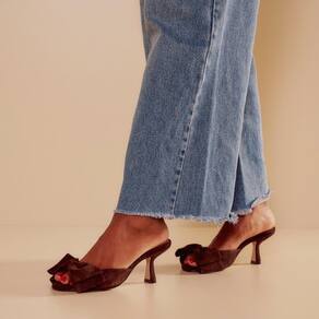A expertise de Luiza Barcelos encontra a visão de estilo de Thássia Naves nesta sandália mule com maxi laço frontal e salto lapidado. Confeccionada em camurça de cabra no tom marrom café, o modelo apresenta bico redondo alongado, que adiciona charme, romantismo e sofisticação à peça.