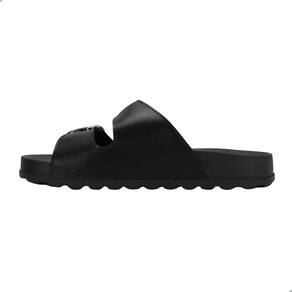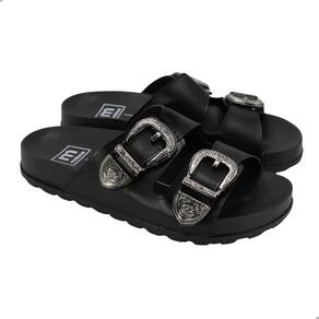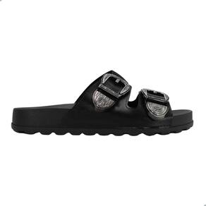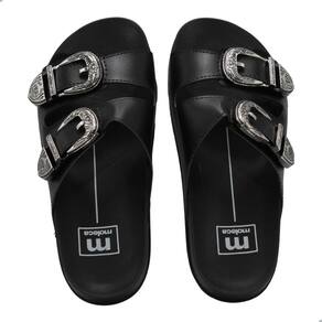 Descrição: Rasteirinha feminina confeccionada em material sintético, fechamento por tira com fivela, tiras no cabedal. Possui palmilha com alta absorção de impacto e umidade com acabamento metalizado, solado flexível, emborrachado com frisos antiderrapante para garantir maior segurança e conforto ao caminhar.