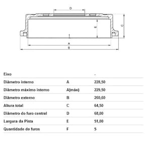 CARACTERÍSTICAS: Traseiro Sem Cubo Diâmetro interno A 228,50 Diâmetro máximo interno TH(min) 229,50 Diâmetro externo B 260,60 Altura total C 64,50 Diâmetro do furo central D 68,00 Largura da pista E 51,00 Quantidade de furos F 5
