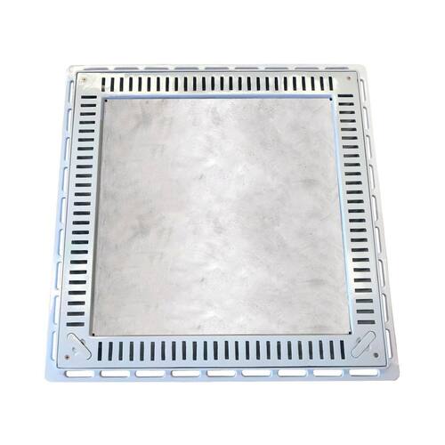 Especificações Técnicas: • Medidas externas: 80x80cm | internas: 62x62cm • Altura do rebaixo: 1,8cm | Altura total: 6,7cm • Drenagem com cano de 50mm | Escoamento: 1,2cm • Abertura de 90° com puxador embutido e sistema de ventilação • Peso aproximado: 23kg