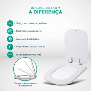 Durabilidade e Resistência: Fabricado em resina maciça de poliéster, este assento sanitário é altamente resistente e totalmente impermeável.