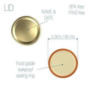 - Material: Livre de BPA e PFAS. Serve para todos os potes de vidro Regular Mouth da marca Anchor Hocking and Ball. As tampas e faixas para conservas são feitas de aço folha-de-flandres de alta qualidade para garantir durabilidade e confiabilidade. A junta, quando aquecida e resfriada adequadamente, cria uma vedação hermética e inviolável e um encaixe seguro no frasco para fornecer armazenamento prolongado do produto. Design amigável - você pode usar um marcador para marcar informações relacionadas a alimentos na tampa.