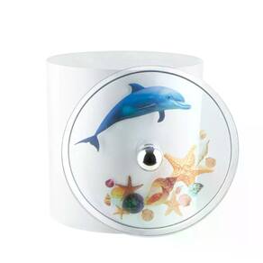 O corpo do cesto é produzido em plástico polipropileno na cor Branco, é muito resistente e fácil de limpar. A tampa é fabricada em Resina Poliéster transparente decorado com Golfinho e Estrela Do Mar, possui acabamento impecável e irá trazer ainda mais elogios para seu banheiro.
