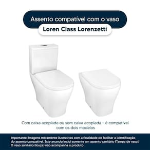 Detalhes e Cuidados Especiais: * Cor: Branco * Compatibilidade: Modelo Loren Class da marca Lorenzetti * Conteúdo da Embalagem: Assento sanitário, parafusos de fixação e instruções de instalação. * Fabricante do Assento Sanitário: Pontto Lavabo.