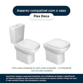 Instalação Simples e Rápida: Com todos os parafusos e componentes necessários inclusos, a instalação é rápida e descomplicada. Seu novo assento estará pronto para uso em questão de minutos. Desenvolvido especificamente para o modelo Flex da marca Deca, com ou sem caixa acoplada, proporciona um encaixe perfeito, oferecendo estabilidade e conforto durante o uso.