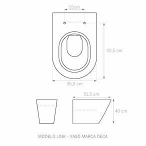 Assento Sanitário (tampa de vaso) fabricado em madeira MDF com pintura laqueada, com proteção raios UV, que garante excelente acabamento e durabilidade. Compatível com vasos (bacias/louças) sanitários com ou sem caixa acoplada. Tem calços de PVC instalados na tampa e no assento para proporcionar estabilidade ao uso, pois distribui o peso uniformemente sobre a louça sanitária. Montagem simples e fácil. Possui ferragem em alumínio anodizado que não enferruja/oxida e oferece muita resistência. O assento é acompanhado por parafusos para instalação. Embalagem dupla reforçada garante o recebimento do produto totalmente protegido. Especificações: - Dimensões da caixa: largura: 49,50cm. Altura: 4,00cm comprimento: 39,50cm - Peso do produto: 1,98kg - Acabamento: brilhante - Uso: este assento é adequado para uso na louça Deca modelo Link - Garantia: 3 meses - Itens inclusos: Tampa e assento em MDF com calços de PVC, ferragem inoxidável, embalagem duplamente reforçada. Contém todos os parafusos e encaixes para instalação, sendo necessária somente uma chave de fenda para instalar o produto na louça sanitária. Instalação: posicione o produto, devidamente centralizado, em cima do vaso sanitário. Sem desmontar a ferragem, insira as buchas de borracha dentro dos furos da bacia sanitária. Encaixe os parafusos e posicione as porcas. Utilizando uma chave de fenda, aperte o parafuso no sentido horário até que o assento esteja firme e fixo no vaso. Manutenção: recomendamos a limpeza periódica com pano levemente umedecido com sabão neutro. Não usar esponjas abrasivas ou palha de aço nem qualquer tipo de produto químico.