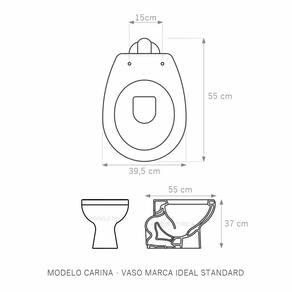 Assento Sanitário (tampa de vaso) fabricado em madeira MDF com pintura laqueada, com proteção raios UV, que garante excelente acabamento e durabilidade. Compatível com vasos (bacias/louças) sanitários com ou sem caixa acoplada. Tem calços de PVC instalados na tampa e no assento para proporcionar estabilidade ao uso, pois distribui o peso uniformemente sobre a louça sanitária. Montagem simples e fácil. Possui ferragem em alumínio anodizado que não enferruja/oxida e oferece muita resistência. O assento é acompanhado por parafusos para instalação. Embalagem dupla reforçada garante o recebimento do produto totalmente protegido. Especificações: - Dimensões da caixa: largura: 51,50cm. Altura: 4,00cm comprimento: 38,00cm - Peso do produto: 1,98kg - Acabamento: brilhante - Uso: este assento é adequado para uso na louça Ideal de modelo Carina - Garantia: 3 meses - Itens inclusos: Tampa e assento com calços de PVC, ferragem inoxidável, embalagem duplamente reforçada. Contém todos os parafusos e encaixes para instalação, sendo necessária somente uma chave de fenda para instalar o produto na louça sanitária. Instalação: posicione o produto, devidamente centralizado, em cima do vaso sanitário. Sem desmontar a ferragem, insira as buchas de borracha dentro dos furos da bacia sanitária. Utilizando uma chave de fenda, aperte o parafuso no sentido horário até que o assento esteja firme no vaso. Manutenção: recomendamos a limpeza periódica com pano levemente umedecido com sabão neutro. Não usar esponjas abrasivas ou palha de aço nem qualquer tipo de produto químico.