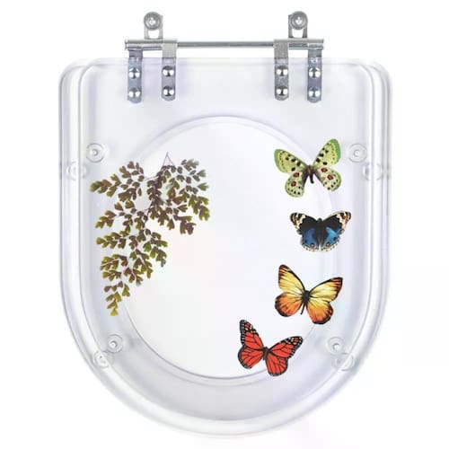 Tampa De Vaso Decorada Etna Transparente Borboletas 6lpf Tampa De Vaso Decorada Etna Transparente Borboletas 6lpf é a escolha perfeita para seu banheiro. O Assento Sanitário Poliéster é considerado o melhor tipo de assentos sanitários do mercado pelo seu acabamento impecável e excelente durabilidade. Este assento de vaso sanitário Etna Transparente é produzido em resina maciça de poliéster. O poliéster é uma resina semelhante ao acrílico, só que mais robusta / resistente. Por isso, é totalmente impermeável, pode ser lavado com água à vontade. Fácil de limpar. Não acumula sujeira.